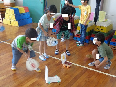 2年生の生活科の学習の一環として、「おもちゃランド」の取組を行いました。2年生たちが、自分たちで協力して作った手作りのおもちゃやゲームを、1年生たちに楽しんでもらおうと計画し、一所懸命準備をしてきました。1年生は2年生に遊び方やルールを優しく丁寧に教えてもらって、みんなたのしく遊びました。体育館には歓声と笑顔が溢れ、「おもしろかった」「もっとやりたい」「え、もう終わり?」などの声が聞かれました。この活動を通して、1年生と2年生の交流が深まり、さらに仲良くなったようでした。