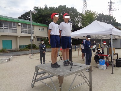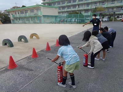 10月22日に、消防士、救助隊の方に来ていただいて、学習活動を行いました。119番通報の仕方や消火器の使い方を教わって、目標物に消火剤をかける体験をさせていただきました。私たちのいのちや暮らしを守るために日々働いていらっしゃる消防士や救助隊の方々のお仕事の様子を間近で学びことができました。