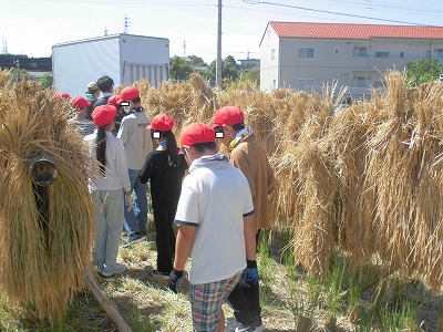 脱穀をしました。乾燥させた稲の穂先から籾を落とす作業が脱穀です。コンバインで稲刈りと脱穀が一気にできますが、昔は、千歯こきで、鉄の歯の隙間に稲の穂先を入れて手作業ですべて行って話を聞き、子どもたちは驚いていました。