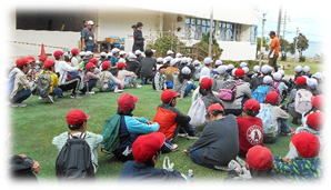 防災の日に全校で防災訓練、シェイクアウト訓練を行いました。地震が起こったことを想定し、机の下に避難し、そのあと家庭科室から火が出たという想定で、運動場に避難しました。今日は、熱中症指数が高かったので運動場までの避難経路の確認をしました。