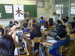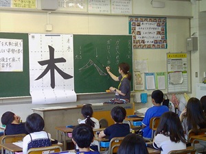 〇3年生が、書道の先生をお招きし、はらい方、力の入れ方などに気を付けながら「木」を書きました。