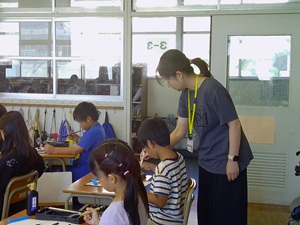 初めてタブレットを扱う1年生の使用開始日には、縦割りの6年生が教えに来てくれました。