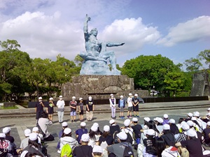 左から、被爆者の方のお話、長崎原爆資料館見学、平和公園での平和集会