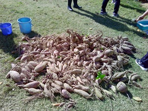 左から、いも博士とPTAの皆さんによるいもづるの撤去、いもほりの様子、収穫したさつまいも
