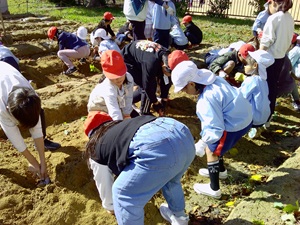 2年生:光沢寺中井幼稚園・第二保育園の年長児さんとさつまいもの苗を植えました。